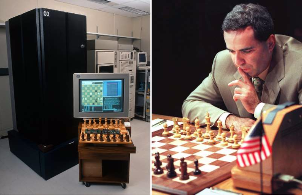 Siêu máy tính Deep Blue của IBM thay mặt cho trí thông minh nhân tạo đã đánh bại con người trong môn cờ vua. Siêu máy tính IBM Deep Blue đã đánh bại nhà vô địch cờ vua thế giới Kasparov ngày 11 tháng 5 năm 1997. Siêu máy tính này đã thắng hai ván và hòa ba. Đây là lần đầu tiên một chương trình máy tính đánh bại một nhà vô địch cờ vua thế giới trong một trận đấu theo quy định của liên đoàn cờ vua quốc tế. Năm 2003, Garry Kasparov đã đấu hai trận với hai chương trình tên là Deep Junior và X3D Fritz. Cả hai trận đấu đều có kết quả hòa.