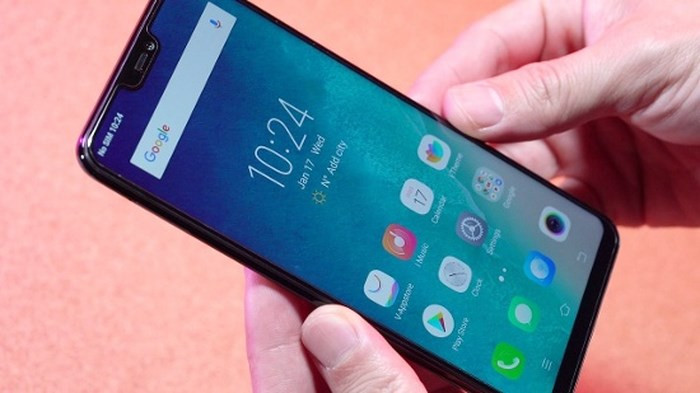 Màn hình: Vivo V9 sở hữu màn hình khá lớn với kích thước 6.3 inch, sử dụng tấm nền IPS LCD độ phân giải Full HD + (1080x2280 pixel) và được bảo vệ bằng kính cường lực Corning Gorilla Glass cong 2.5D. Với thiết kế màn hình tai thỏ nên màn hình V9 hiển thị với tỷ lệ 19:9 và viền màn hình chỉ mỏng 1.75mm.