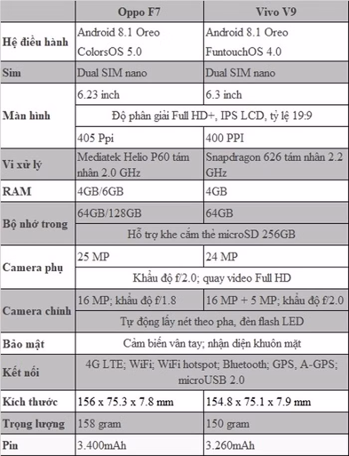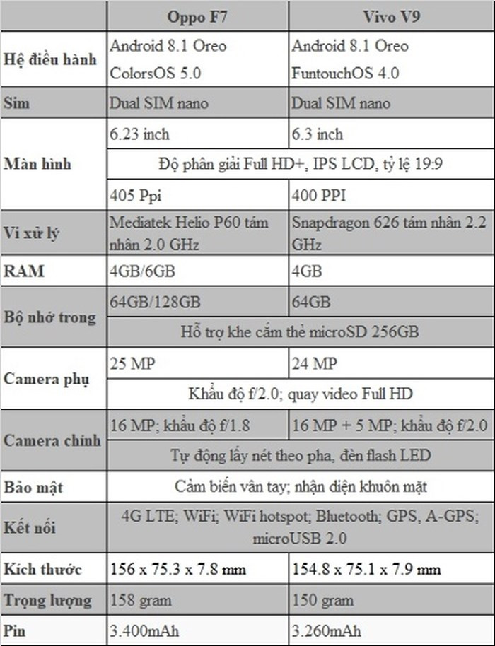Bảng so sánh cấu hình giữa Oppo F7 và Vivo V9