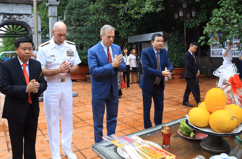 Đại sứ Mỹ tại Việt Nam Ted Osius và Tư lệnh Hạm đội Thái Bình Dương Scott Swift thắp hương tại khu di tích Bạch Đằng Giang. Ảnh Duy Thính