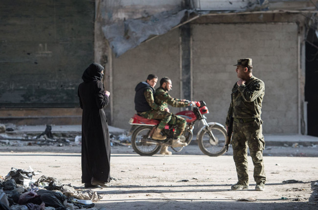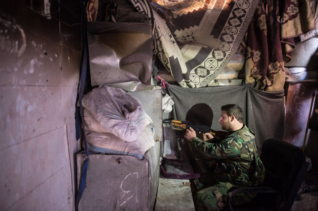 Ngược lại với tình hình ở Damascus, các phần tử khủng bố ở Aleppo không bị bao vây. Chúng kiểm soát các quận được coi là cửa ngõ nối với vùng ngoại ô phía tây và phía nam của thành phố. Nhiều thông tin cho rằng các phần tử này đang nhận hỗ trợ từ phía Thổ Nhĩ Kỳ. Trong ảnh: Một binh sĩ của liên quân Syria-Arab chiến đấu tại một khu dân cư ở Aleppo.