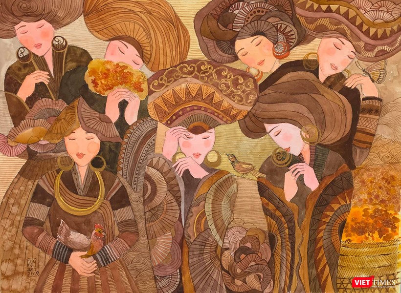 Trang phục thổ cẩm của bà con người dân tộc được Hà Hùng Dũng khai thác triệt để từ đường nét, hoa văn, đến sự hòa trộn nhuần nhuyễn giữa con người, sự vật và nét đẹp tự nhiên của núi rừng.