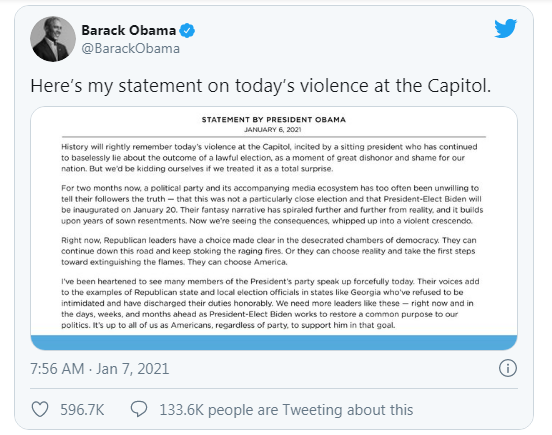 Vào hôm 6/1, sau khi những người ủng hộ Tổng thống Trump xông vào Điện Capitol để gây rối, cựu Tổng thống Barack Obama đã đưa ra một tuyên bố về sự kiện này trên các tài khoản mạng xã hội của ông.