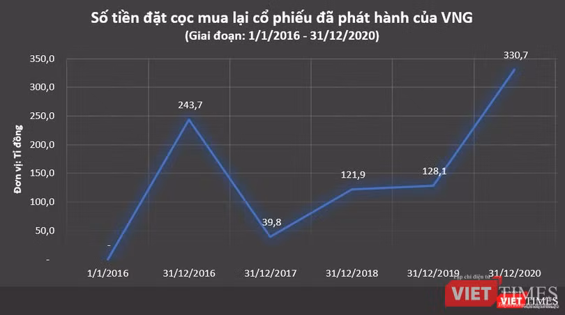 Theo tìm hiểu của VietTimes, từ cuối năm 2016, VNG bắt đầu ghi nhận các khoản đặt cọc mua lại cổ phần, với số dư tại thời điểm ngày 31/12/2016 là 243,7 tỉ đồng (đầu năm 2016 không ghi nhận khoản mục này). Số dư khoản mục này chạm đáy tại ngày 31/12/2017, sau khi VNG mua vào thành công 1.060.846 cổ phiếu quỹ, rồi tăng dần trở lại từ đó tới nay. Cũng trong khoảng thời gian này, công ty mẹ VNG không mua thêm cổ phiếu quỹ mà chỉ thực hiện bán ra 355.820 cổ phần cho Seletar Investment Pte Ltd vào tháng 3/2019.