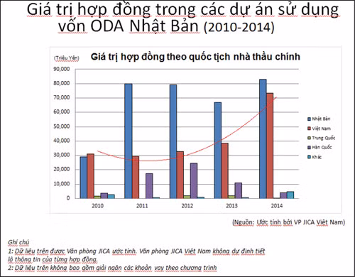 Theo dữ liệu của JICA, giá trị các hợp đồng mà công ty Việt Nam trúng thầu trong các dự án sử dụng vốn vay ODA Nhật Bản có xu hướng tăng hàng năm, từ 31,2 tỷ Yên năm 2010 lên 73,5 tỷ Yên năm 2014.