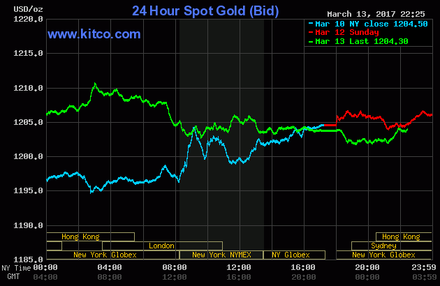 Chốt phiên giao dịch đầu tuần (Thứ Hai ngày 14/3), giá vàng giao tháng Tư trên sàn Comex tại Sở Giao dịch New York Mercantile nhích nhẹ $1,70 (+0,1%) lên chốt tại $1.203,10/oz, chính thức khép lại chuỗi giảm 9 phiên liên tiếp - dài nhất kể từ tháng 7/2015. Đóng tuần trước đó, giá vàng đứng ở $1.201,40 – thấp nhất kể từ ngày 30/01.