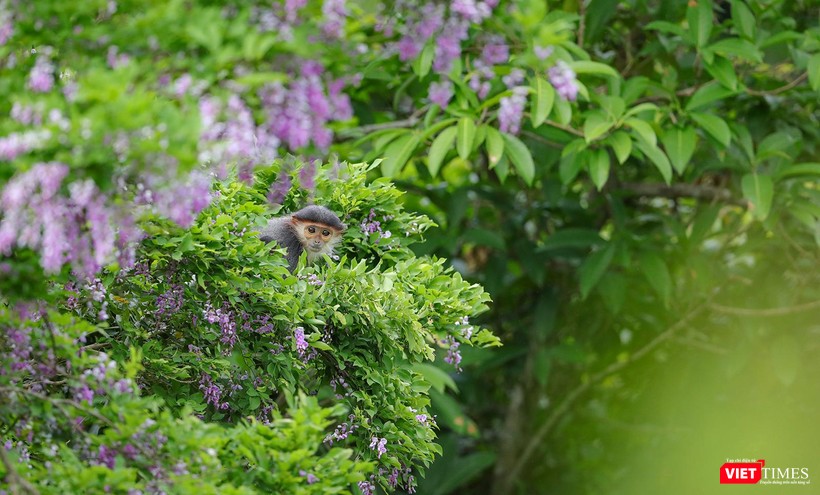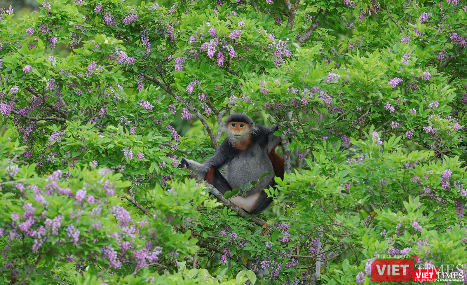 Giới mê nhiếp ảnh thiên nhiên dõi theo từng chuyển động của voọc chà vá chân nâu trên cây thàn mác tím