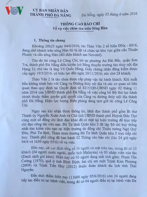 Thông cáo báo chí chính thức của TP Đà Nẵng 11:52 ngày 05/06/2016