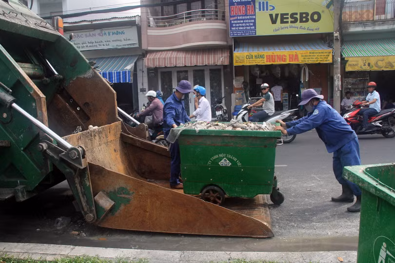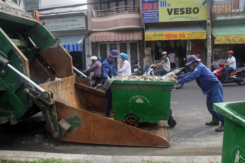 Các thùng rác đựng cá chết được cẩu lên bờ cho vào xe ép rác - Ảnh: Q.Khải