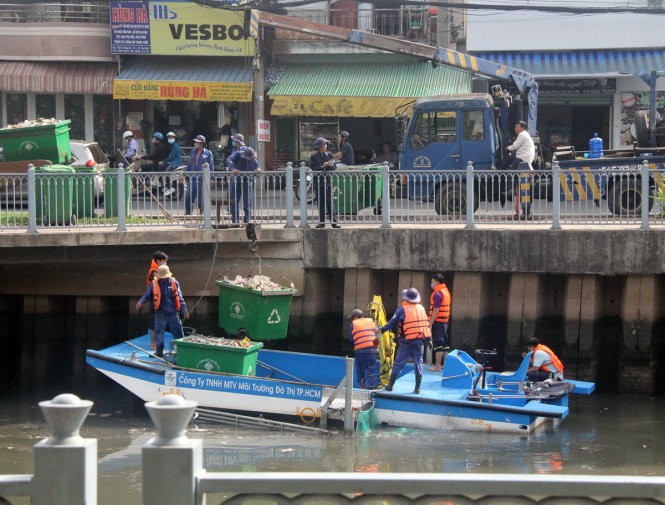 Trước đó, trong buổi sáng 18-5, hơn 10 canô với hàng chục công nhân Công ty TNHH một thành viên môi trường đô thị TP tiếp tục vớt cá chết trên kênh Nhiêu Lộc - Thị Nghè.