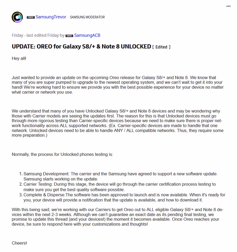 “Chúng tôi hiểu rằng nhiều người trong số các bạn dùng Galaxy S8/S8+ và Note 8 bản quốc tế tự hỏi vì sao những người dùng thiết bị của nhà mạng lại nhận được bản cập nhật trước”. Samsung cho biết: “Chúng tôi đang hợp tác với các nhà mạng để tung ra bản cập nhật Oreo cho tất cả Galaxy S8/S8+ và Note 8 trong vòng 2-3 tuần tới”.