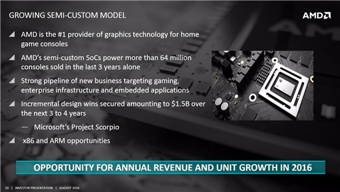 Không chỉ khai thác lợi nhuận từ với các dòng GPU giá rẻ cho PC, AMD tự hào đã cung cấp chip đồ họa cho hơn 64 triệu máy console trong vòng 3 năm qua, thậm chí hãng công nghệ này đang cung cấp chip đồ họa cho dòng máy chơi game đời mới Xbox Scorpio của Microsoft.