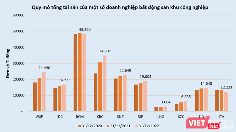Về quy mô tổng tài sản, tính đến cuối năm ngoái, chỉ tiêu này của VSIP chỉ thấp hơn BCM (48.290 tỉ đồng) và KBC (34.907 tỉ đồng), trong khi cao hơn nhiều so với tổng tài sản của IDC (16.733 tỉ đồng), SNZ (22.649 tỉ đồng), SIP (19.003 tỉ đồng).