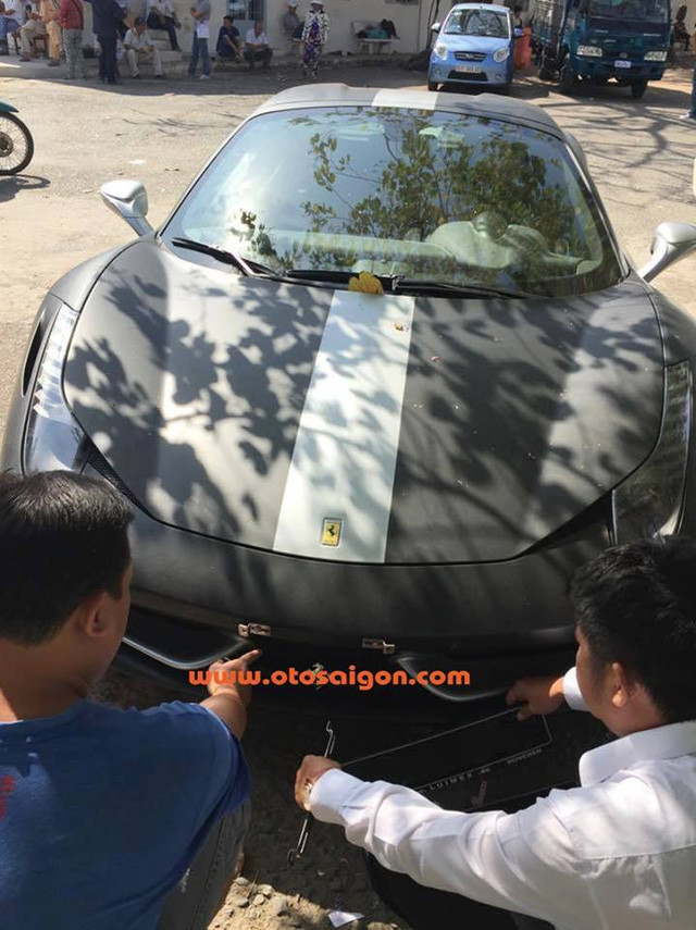 Ferrari 458 Spider đi đăng ký biển số với ngoại thất đã đổi từ đỏ nguyên bản sang đen nhám và bạc. Ảnh: Otosaigon