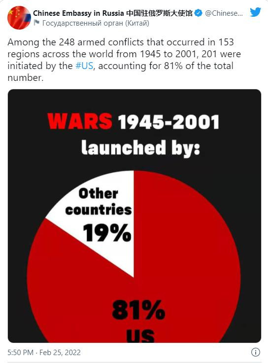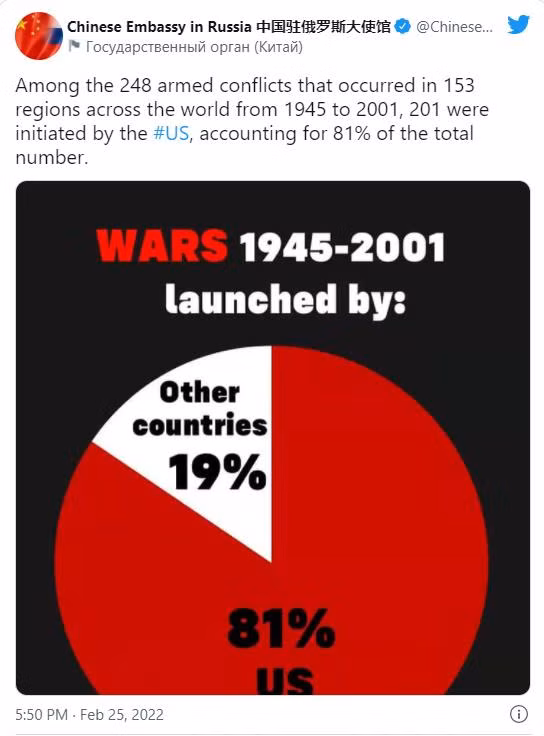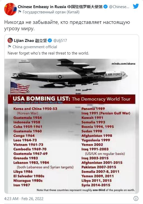 Đại sứ quán Trung Quốc tại Nga trong hôm 26/2 đã đăng lại một hình ảnh mà trước đây phát ngôn viên Bộ Ngoại giao Triệu Lập Kiên từng đăng về nước Mỹ. Đưa ra nhiều sự kiện mà trong đó Mỹ đã không kích và tấn công các nước khác kể từ sau Thế chiến 2, hình ảnh này còn nhấn mạnh rằng những quốc gia chịu ảnh hưởng đại diện cho “gần 1/3 dân số trên hành tinh”.