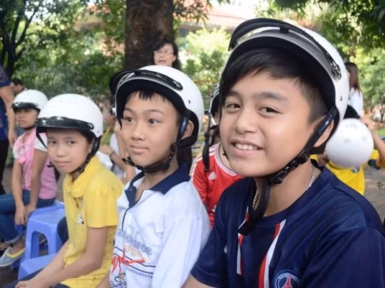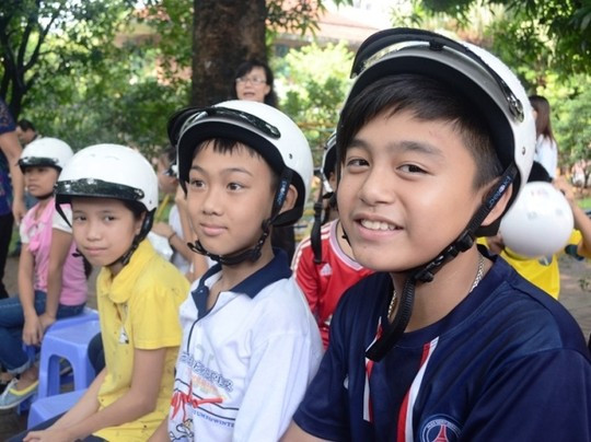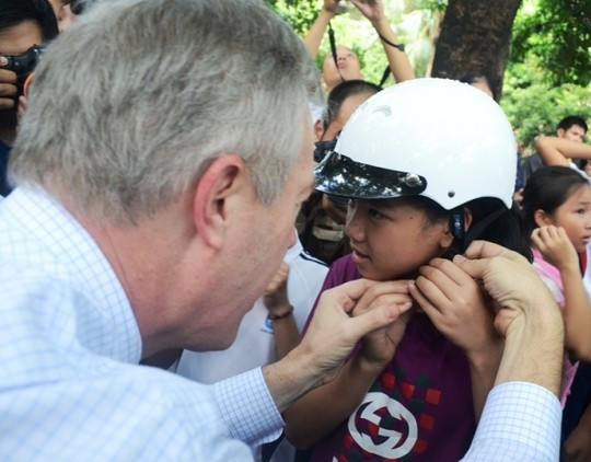 Đại sứ Mỹ cùng Ban giám đốc Làng SOS đeo từng mũ bảo hiểm cho trẻ em trong làng