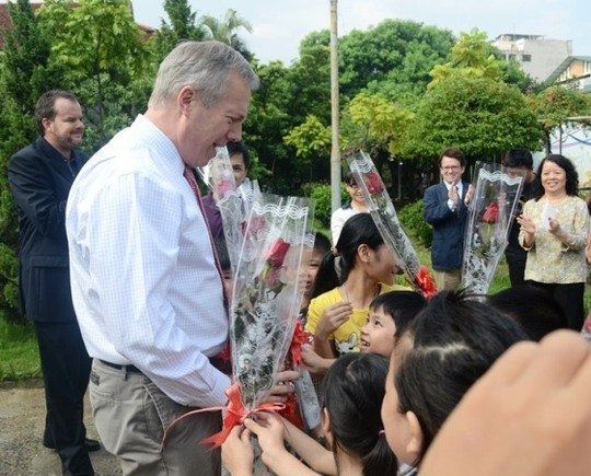 Tới thăm các cháu tại Làng Trẻ em SOS Việt Nam, Đại sứ Mỹ Ted Osius đã được các cháu tặng rất nhiều hoa tươi
