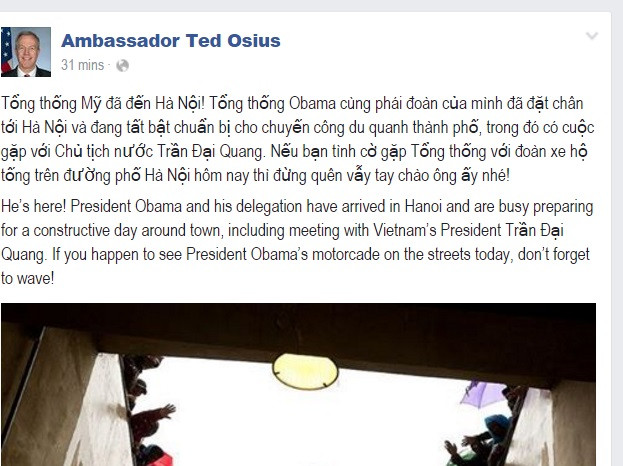 Đại sứ Hoa Kỳ tại Ted Osius viết: "Tổng thống Mỹ đã đến Hà Nội! Tổng thống Obama cùng phái đoàn của mình đã đặt chân tới Hà Nội và đang tất bật chuẩn bị cho chuyến công du quanh thành phố, trong đó có cuộc gặp với Chủ tịch nước Việt Nam Trần Đại Quang.