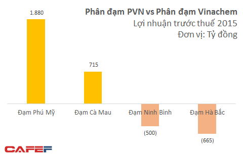 Không những thế, trong khi các nhà máy sản xuất Ure trên thế giới hay Đạm Phú Mỹ, Đạm Cà Mau (những nhà máy thuộc PVN sản xuất đạm từ khí đồng hành khi khai thác dầu) thì 2 DN thua lỗ kia thuộc tập đoàn Vinachem, sản xuất Ure từ than đá. Khi giá dầu giảm, giá khí cũng xuống giúp các DN giảm giá thành nhưng Đạm Ninh Bình và Hà Bắc không được hưởng lợi, kéo theo đó là không có sự cạnh tranh về giá.