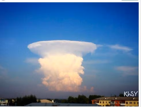 Nhìn từ xa, đám mây khổng lồ trông giống như một cây nấm khổng lồ, loại mây thường xuất hiện sau các vụ nổ bom hạt nhân.
