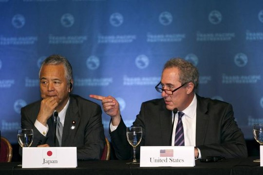 Bộ trưởng kinh tế Nhật Akira Amari và Đại diện thương mại Mỹ Michael Fromam tại bàn đàm phán. Ảnh: Reuters