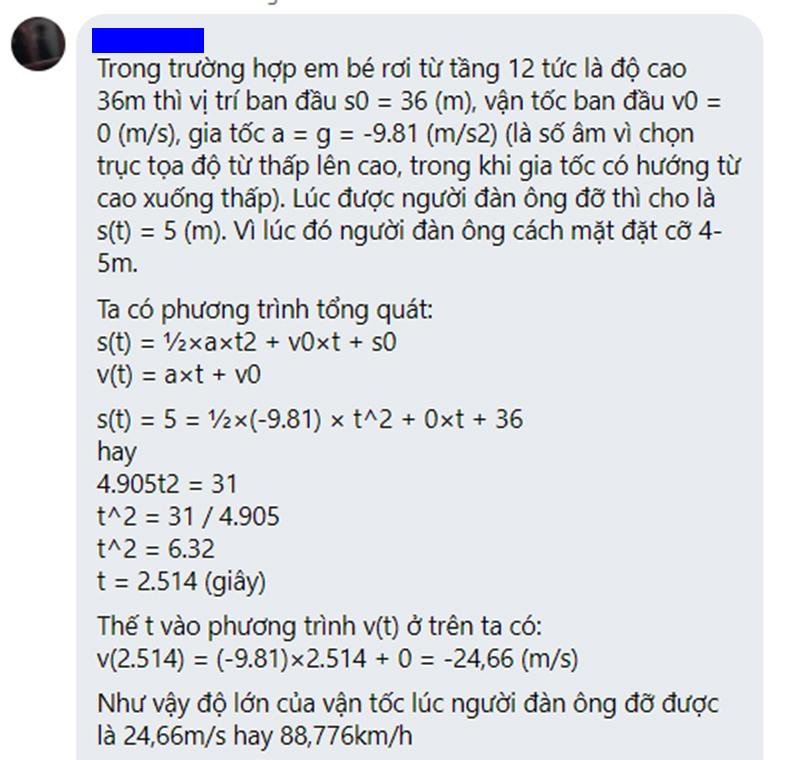 Trong khi đó, một tài khoản khác lại tính toán vận tốc khi em bé chạm tay anh Mạnh: “Trong trường hợp em bé rơi từ tầng 12 tức là độ cao 36m thì vị trí ban đầu s0 = 36 (m), vận tốc ban đầu v0 = 0 (m/s), gia tốc a = g = -9.81 (m/s2) (là số âm vì chọn trục tọa độ từ thấp lên cao, trong khi gia tốc có hướng từ cao xuống thấp). Lúc được người đàn ông đỡ thì cho là s(t) = 5 (m). Vì lúc đó người đàn ông cách mặt đặt cỡ 4-5m.