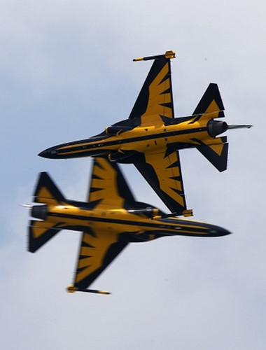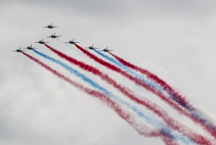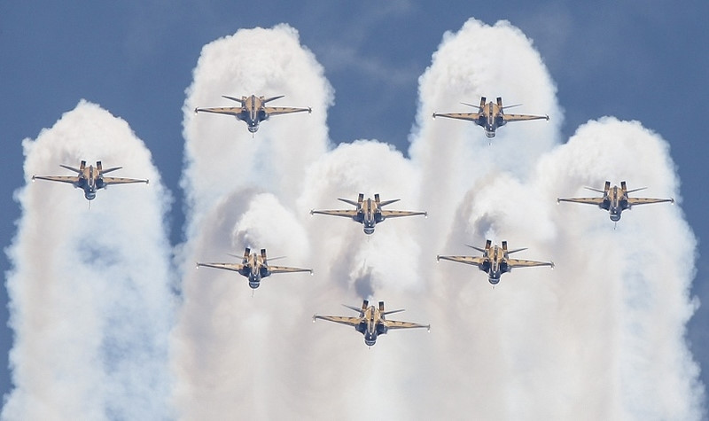 Dàn máy bay T-50 được các phi công của đội bay biểu diễn mang tên "Đại Bàng Đen" của Hàn Quốc bay tại triển lãm. Ảnh EPA
