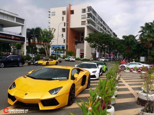 Cặp đôi Lamborghini Aventador LP700-4 màu vàng và trắng thường xuyên tụ tập cùng nhau vào mỗi dịp cuối tuần. Ngoài ra, còn có một chiếc Aventador màu cam của đại gia ngành y tế. Nhiều bạn trẻ mê xe tại Sài thành rất mong muốn được bắt gặp khoảnh khắc bộ ba siêu xe Aventador xuất hiện cùng nhau. Ảnh:Tùng Dương.