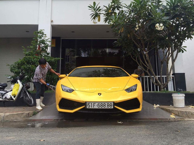 Đây là siêu xe Huracan nổi bật nhất trong số 10 chiếc được đưa về nước, "siêu bò" mang ngoại thất màu vàng độc nhất Việt Nam, cùng chiếc biển số "tứ quý" 8 đẹp mắt. Ảnh: Trung Phong.