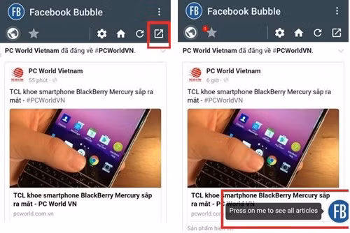Lưu ý, vì truy cập Facebook trên nền web nên Bubble cần một khoảng thời gian để lưu dữ liệu vào bộ nhớ tạm. Do vậy, để ứng dụng này hoạt động trơn mượt, bạn hãy lướt mạng ngay trên giao diện chính một chút trước khi nhấn vào biểu tượng cửa sổ.