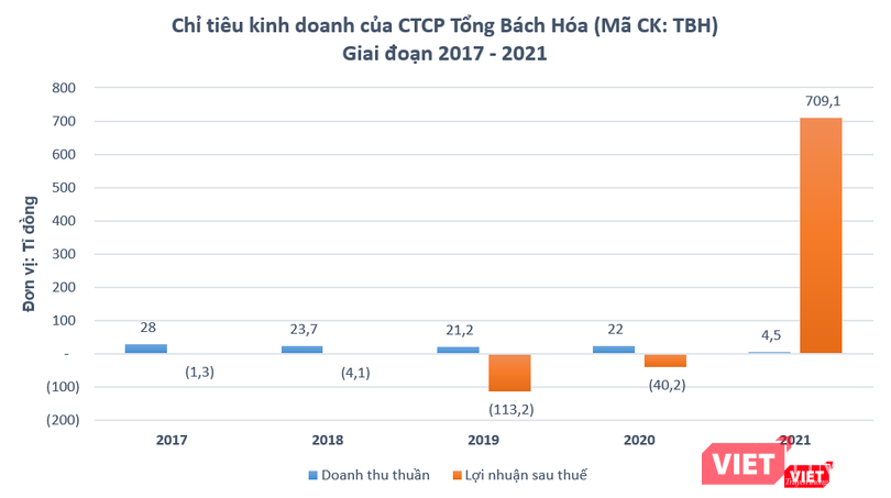 CTCP Tổng Bách Hóa (Mã CK: TBH) vừa công bố kết quả kinh doanh năm 2021, với doanh thu thuần về bán hàng và cung cấp dịch vụ đạt 4,5 tỉ đồng, giảm tới 79,5% so với năm trước. Trừ đi giá vốn hàng bán, công ty này báo lỗ gộp gần 2,4 tỉ đồng, trong khi chỉ tiêu này của năm 2020 là lãi 12,4 tỉ đồng.
