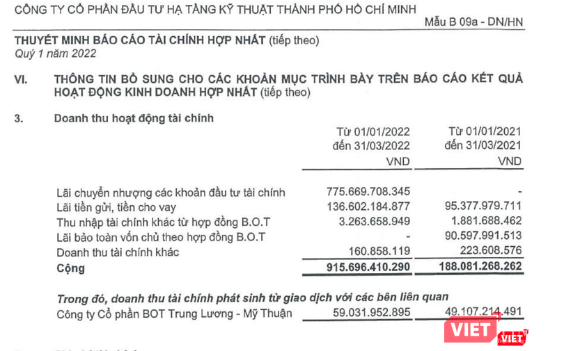CII cho biết, doanh thu hoạt động tài chính của công ty trong quý đầu năm 2022 chủ yếu đến từ lãi chuyển nhượng các khoản đầu tư tài chính đạt 775,6 tỉ đồng (cùng kỳ năm 2021 không phải sinh khoản này); lãi tiền gửi, tiền cho vay đạt 136,6 tỉ đồng (tăng 43% so với cùng kỳ năm 2021).