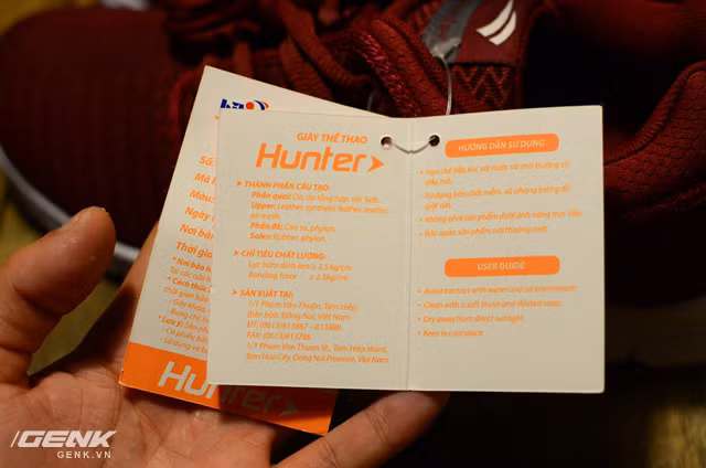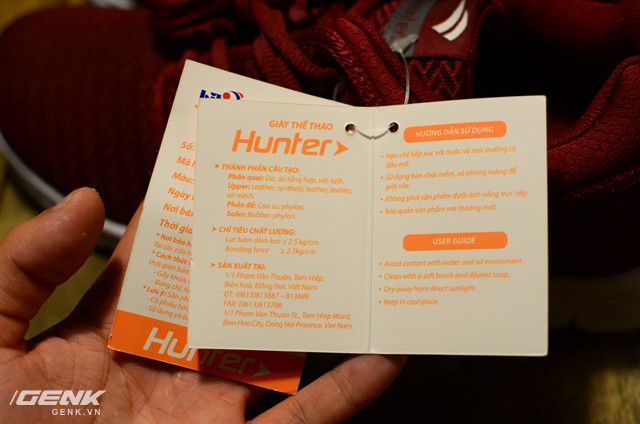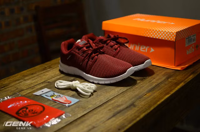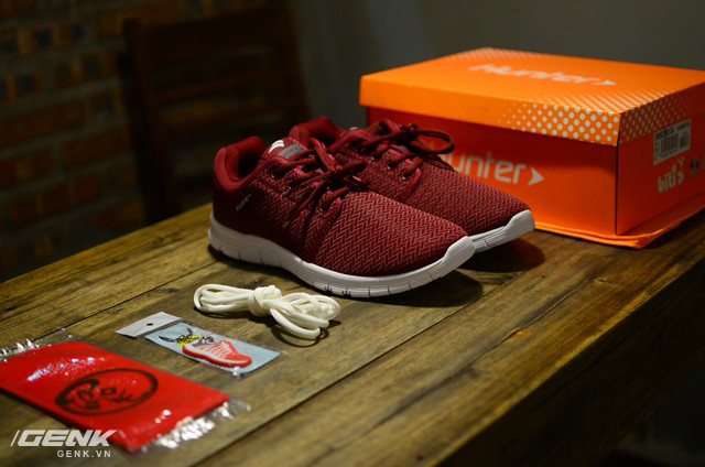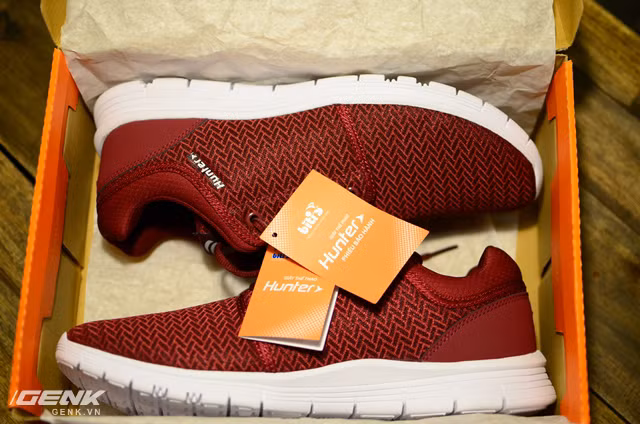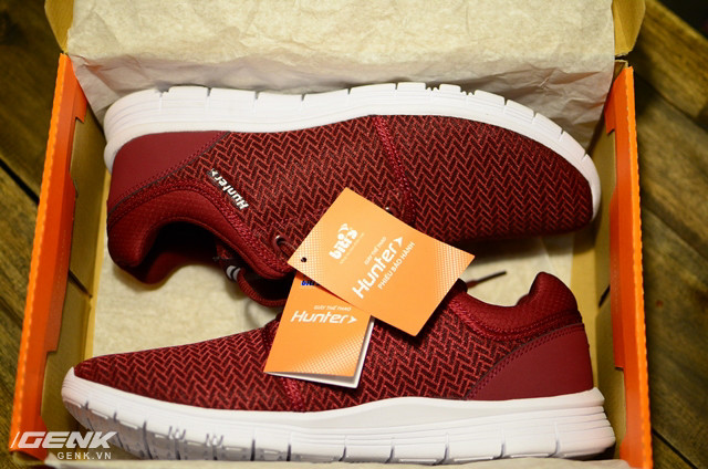 Bên trong hộp là đôi Hunter Feast được xếp gọn gàng, vẫn còn thơm mùi keo của giày mới. Đi kèm là phiếu bảo hành, hướng dẫn sử dụng, một đôi dây giày trắng, bao gồm cả quà tặng là móc treo chìa khóa Biti's Hunter Originals (phiên bản đầu tiên) và một xấp phong bao đỏ.