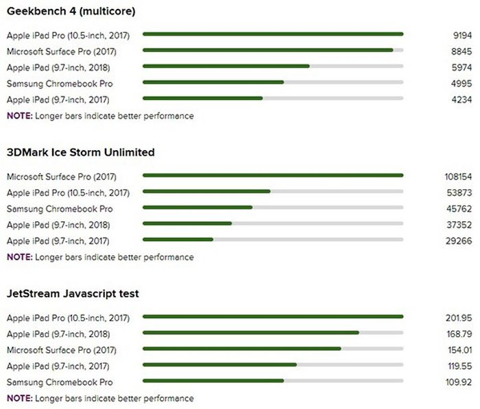 iPad 9.7 (2018) được trang bị vi xử lý Apple A10 (có trên iPhone 7 / 7 Plus) cải thiện đáng kể hiệu suất. Trừ những mẫu iPad Pro năm ngoái và bộ ba iPhone 8 / 8 Plus / X, chiếc tablet này vượt qua tất cả iPhone và iPad còn lại ở những bài kiểm tra sức mạnh bằng phần mềm benchmark.