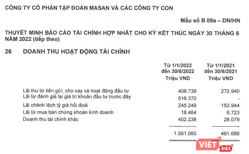 Bên cạnh hoạt động kinh doanh chính, trong nửa đầu năm 2022, MSN còn ghi nhận tới 1.591 tỉ đồng doanh thu hoạt động tài chính, cao gấp 3,4 lần so với cùng kỳ năm trước.