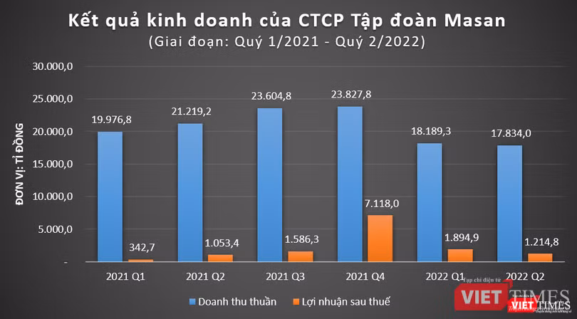 Luỹ kế 6 tháng đầu năm 2022, MSN ghi nhận doanh thu thuần đạt 36.023 tỉ đồng, giảm 12,5% so với mức 41.196 tỉ đồng của cùng kỳ năm 2021.