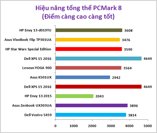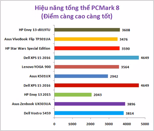 Thực tế đã được chứng minh khi kết quả đo kiểm dùng các công cụ benchmark như PCMark, Geekbench hay 3DMark đều cho thấy cách biệt điểm số giữa 2 máy rất sít sao. Cụ thể, phép thử hiệu năng tổng thể PCMark – Work cho thấy cách biệt điểm số giữa HP Envy 13-d019TU và Lenovo YOGA 900 chỉ ở mức 112 điểm.