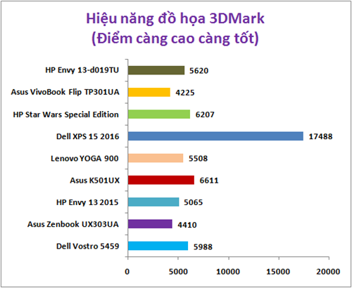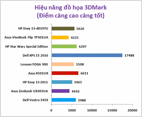 Trong phép thử hiệu năng đồ họa 3DMark Cloud Gate, HP Envy 13-d019TU cũng chỉ nhỉnh hơn đối thủ từ Lenovo 44 điểm. Tuy nhiên, nếu so với người anh em HP Envy 13 2015 từng thử nghiệm, sức mạnh từ bộ xử lý Intel Core i7-6500U đã phát huy tác dụng rõ rệt (xem biểu đồ) khi cách biệt điểm số vượt qua mức 1.500 điểm.