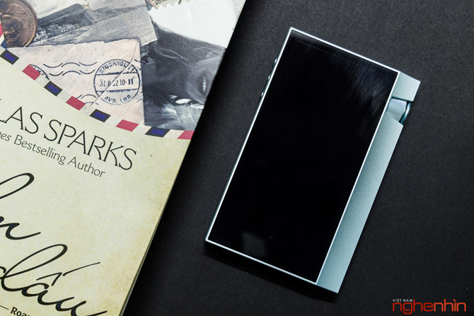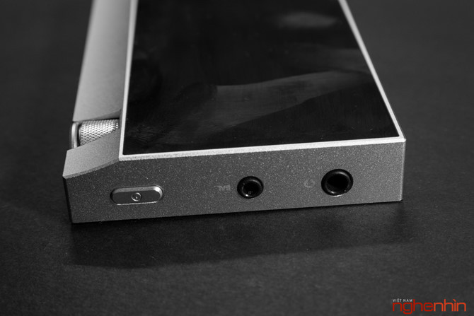 Cạnh trên máy có nút nguồn, ổ cắm tai nghe 3,5mm thường và một cổng 2,5mm balanced. Cạnh dưới máy có cổng sạc microUSB. Mặt sau đơn giản với lô-gô Astell & Kern cùng một vài thông tin về tên sản phẩm, mã máy và địa điểm sản xuất tại Hàn Quốc.