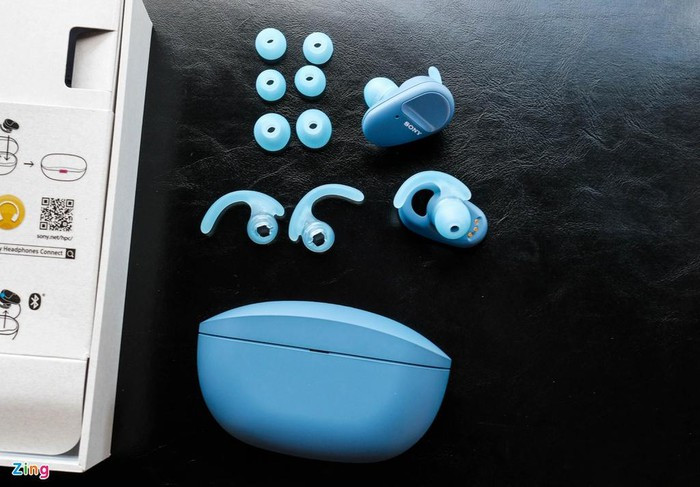 Sony WF-SP800N được bán kèm với một cặp móc tai vòng cung và 3 cặp nút đệm tai kích thước khác nhau. Tất cả phụ kiện đệm tai đều làm bằng vật liệu silicon dẻo, khá mềm, có màu trùng với lựa chọn màu sắc chính của tai nghe. Ngoài ra, sản phẩm đi kèm với một dây sạc USB-C dài khoảng 25 cm.