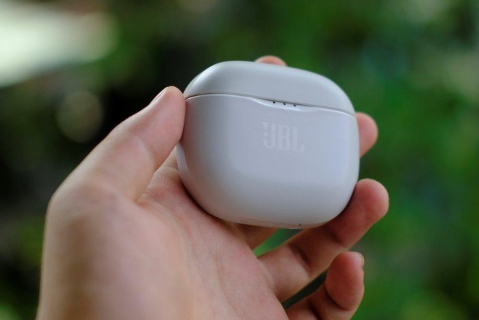 Hộp đựng JBL Tune 120tws nhỏ gọn, có thể nhét dễ dàng vào túi quần. Nắp hộp sử dụng nam châm để giữ nên việc đóng mở khá tiện lợi, cùng với đèn LED nhỏ phía dưới để kiểm soát lượng pin còn lại.