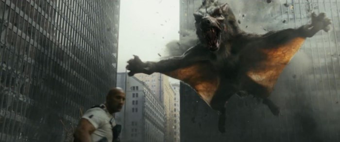 The Rock (cầm súng đứng ở giữa) và các quái thú trong phim Rampage