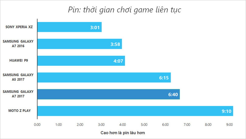 So sánh trực tiếp với chiếc Moto Z Play dùng vi xử lý Qualcomm Snapdragon 625 thì A7 vẫn thua một chút về độ mượt, cũng như khả năng thể hiện các chi tiết đồ họa trong game. Có lẽ chiếc điện thoại của Moto được tối ưu tốt về mặt phần mềm nên hiệu năng thực tế tốt hơn, còn trong các ứng dụng đánh giá hiệu năng như Antutu, GeekBench hay GFXBench thì Galaxy A7 đều có điểm số cao hơn.