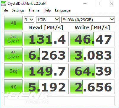 Các bài test đơn giản được thử trên Windows 10 với CrystalDiskMark và BlackMagic Disk Speed Test trên MacBook Pro 13" 2016 chạy macOS Sierra 10.12.1. Tốc độ đọc gần tương đương với con số quảng cáo. Trong khi đó, tốc độ ghi có thể chạm gần 100 MB/giây là một con số khá ấn tượng nhất là khi so với giá thành của sản phẩm.