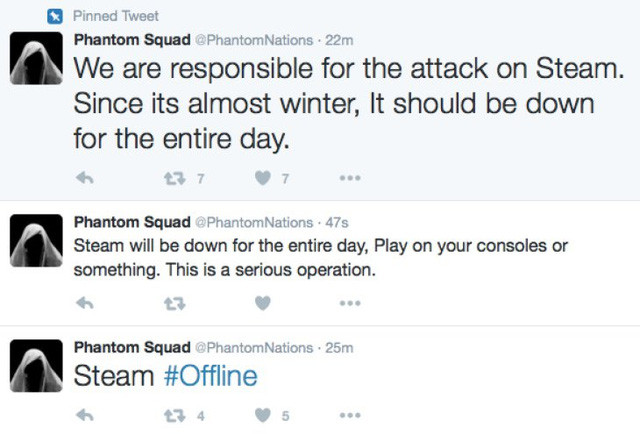 Nhóm hacker PhantomNations ngay sau đó đã đăng tải lên Twitter, nhận trách nhiệm về cuộc tấn công này. Chúng còn tỏ ra vô cùng ngạo mạn khi cho biết "Steam sẽ sập trong nguyên 1 ngày, và bạn nên quay ra chơi game trên Xbox hay PS4".