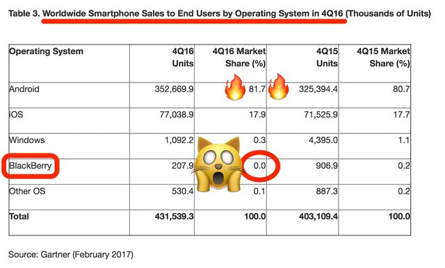 Trong Q4/2016, đã có 431 triệu chiếc điện thoại được bán ra, theo một báo cáo do công ty nghiên cứu thị trường Gartner thực hiện được công bố vào thứ tư vừa qua – và trong số đó, chỉ có 207.900 thiết bị mang nhãn mác “Dâu Đen” chạy hệ điều hành BlackBerry OS mà thôi.