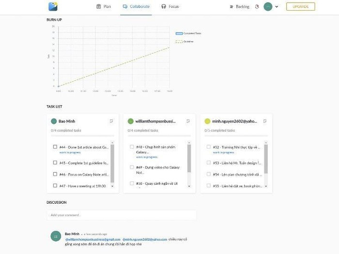 Được thiết kế để phù hợp với ngay cả nhóm lớn, các hạng mục công việc cả team được thể hiện trực quan và dễ theo dõi công việc từng người ở mục Collaborate. Tại đây còn có phần Discussion để cả team trao đổi nhanh công việc, không cần phải dùng tới các ứng dụng nhắn tin bên ngoài.