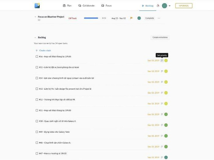 Đồng thời các thành viên trong team có thể tương tác với nhau qua từng đầu mục công việc cụ thể, gửi file đính kèm một cách nhanh chóng. Việc gắn nhãn, đặt cờ ưu tiên cho các hạng mục khác nhau là tính năng rất hữu ích khi giúp người dùng dễ dàng nhận biết hơn ngay cả lúc số lượng công việc đang triển khai là rất nhiều.