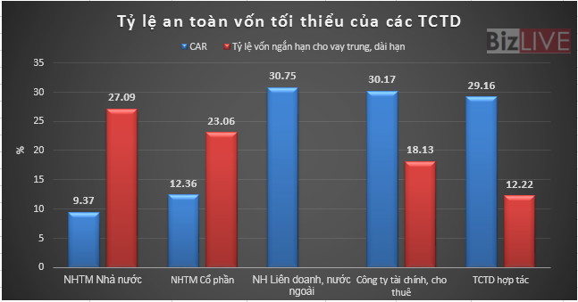 Một số liệu khác cũng được chú ý đó là tỷ lệ an toàn vốn tối thiểu (CAR). Tỷ lệ an toàn vốn tối thiểu của toàn hệ thống là 12,93%, thấp nhất là các ngân hàng TMCP Nhà nước với tỷ lệ 9,37%.