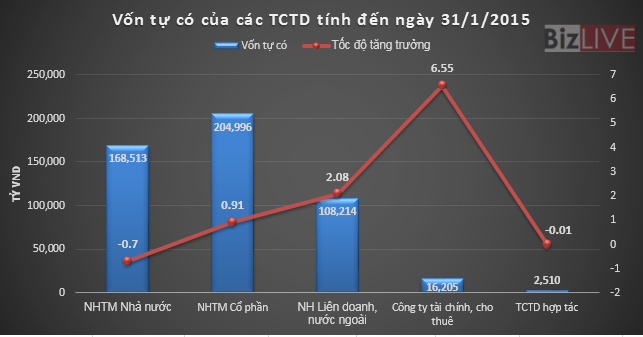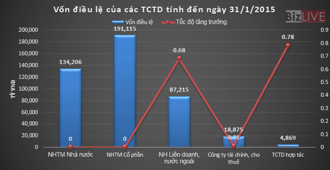 Vốn điều lệ trong tháng 1/2015 chỉ tăng vỏn vẹn 0,14% đạt 436.280 tỷ đồng toàn ngành. Vốn điều lệ tại nhóm các ngân hàng thương mại cổ phần và Nhà nước không tăng trưởng.